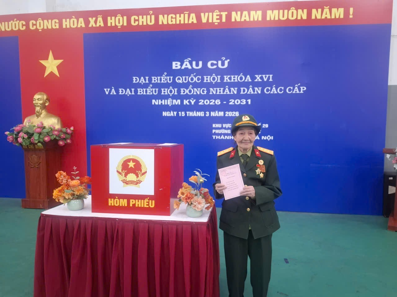 Cử tri tiêu biểu - cụ Trần Kim Thành (du kích Hoàng Ngân), Hội viên Hội CCB Chi hội 53 tham gia bỏ phiếu tại Đơn vị bầu cử số 7